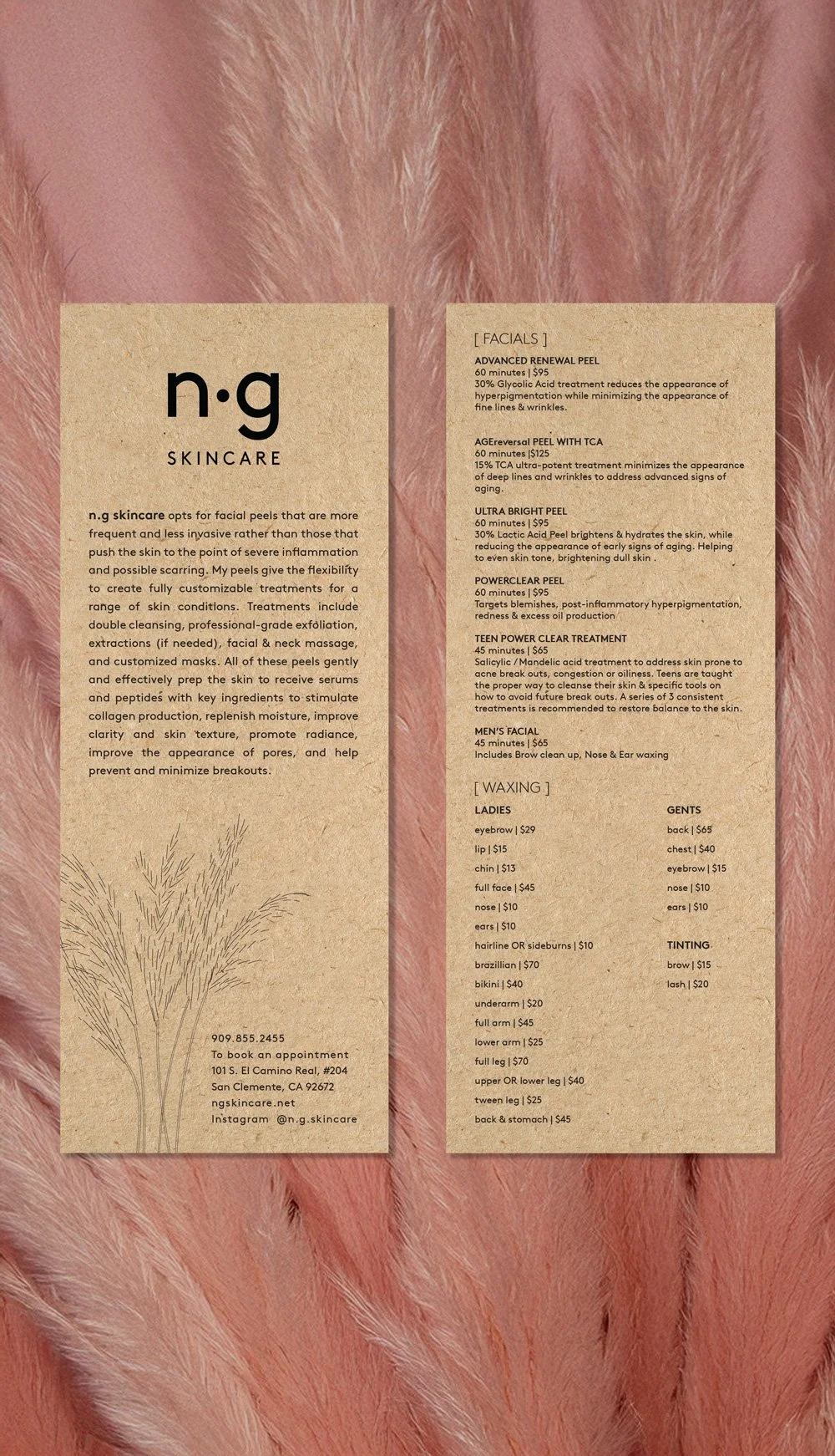 When Nicole from NG Skincare came to us, she had a vision for her wellness business, and we couldn’t wait to bring it to life. We designed a custom logo and a comprehensive brand guide that perfectly captured her mission of promoting radiant, healthy skin. To complement the brand, we created chic business cards and beautifully designed service menus that truly elevate her client experience.
